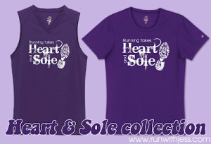 You can choose one or more distances to complete over the race week from April 1 to April 8th.  Of course, I signed up for all 4 events, Go Big or Go Home, right?  You also have the option to purchase a race shirt which says “Running takes Heart and Sole“.  Good one, Jess!  Love it!