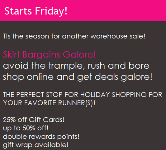 RunningSkirts.com – Discounted skirt prices up to 50% off, 25% off Gift Cards and double reward points!