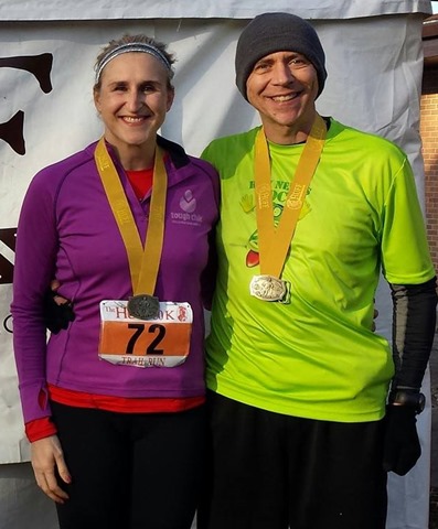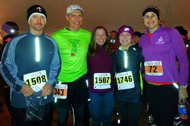 Prerace with friends, photo on left: Austin B, Mike S (Run Nerds Rock), Adella B, Brandi M & me. Photo on right, a few of the FNRC members who were running: me, Susan M & Nicole F.