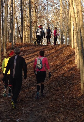 The trail was also covered in fallen leaves and hid the roots, rocks and wooden beams that held the trail together on the ups and downs. We were very careful but still stumbled, tripped and slid on multiple occasions. Very typical of trail running, which is why hard soled trail shoes are necessary to protect your feet and toes!