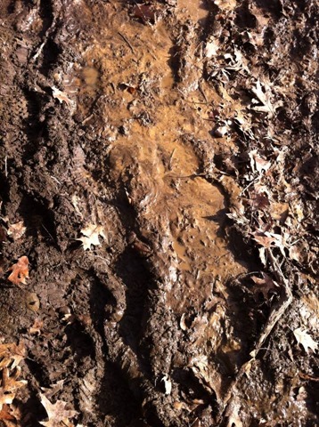 We both utilized the bag drop at the half way point and after a 20 minute layover to fix our feet, change shoes, readjust/shed clothing, potty, eat, text and Facebook (you know the important things) we headed out for the second 15.5 mile loop. It was pure mud. The 1000 people between the three races, plus the sun and warming temps had done their job to thaw our frozen trail. We slid around this loop and sometimes even had to use bushes on the side of the trail to help pull us up the hills. I was in a total panic, sliding down the hills afraid that I would fall and manage to get hurt and ruin myself for Dopey. Kasey even offered to throw herself in front of me if I started falling/sliding down the hill to coerce me into going faster break my fall. But I was focused on being overly cautious to avoid a fall/slip. The theme of the second loop was mud and survival. I had a very hard time getting thru miles 24-29. I was all done. I was tired of the mud. Angry that we were sloshing and splashing each other. Angry that 31 miles seemed like a good idea. But we just kept moving forward, sometimes at a snails pace but relentlessly moving forward. Mud on the left, me walking down the trail on the right.