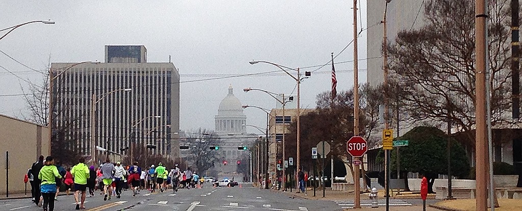 The race directors even dressed up like super heroes and stood on top of start (by the right flag) and started each of the corrals the morning of the race. In the pouring rain. At 3-4 minute intervals. It took us 22ish minutes to get across the start line and begin our journey thru town. The first mile was crowded as always but the road soon opened up and we were on our way! Temps at the start were in the 50s with rain so we were pretty tight from shivering in the rain while we waited to get started; however, after 4 miles or so we were loose, warmed up, the rain gave us a short reprieve and we were READY TO RUN! We wove thru town, ran across the big bridge and saw Capitol Building.