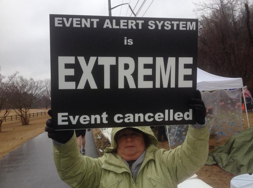 So we kept moving. Not quickly but not dawdling either. We didn’t walk thru water stops, just slowed til everyone could get in fluid and fuel. We had to help each other a bit with our fuel cuz our fingers were so frozen we couldn’t get into our belts. Or open the packages for the gels/chews. Our pace seemed solid though and our spirits were high. We loved the course. We loved the houses. We loved seeing so many Marathon Maniacs and yelling support to as many as possible. It was fun. We were honestly having fun. There was a decent amount of entertainment. The course was diverse and interesting. Aid stations were well stocked with water & Gatorade. There were food stations with pretzels, bananas, oranges, jolly ranchers, & GU. There were surprisingly a lot of spectators considering the weather conditions (wind, rain, thunderstorms, and a promise of hail and freezing rain to come). It was all good until mile 20 when we saw the first sign that said that the race was canceled and we needed to get off the course.