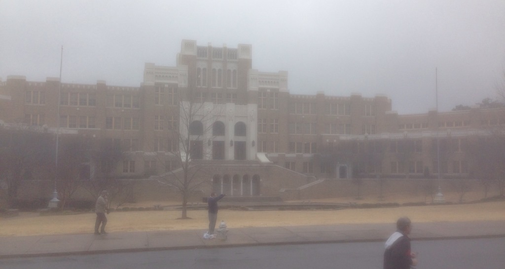 The real test of the marathon is patience. I’m not a fan of waiting. In fact, I really can’t stand to wait. This is the reason why marathons and I don’t really get a long. BUT in Little Rock I was with friends and the goal was to have fun. I had zero expectations and I’m not really sure they did either, if they did they were quiet about it. We knew the weather was going to be an issue. We knew there would be hills but we had no idea what to REALLY expect. So we were patient. We didn’t dawdle but didn’t run fast, just kept eating up the pavement, stopped for a potty (or two) and just kept moving. When I noticed a hill, I just put my head down and ran up without looking beyond the pavement in front of me so that it didn’t drain me mentally. Then the rain came faster and harder. Then the wind came. Temps started dropping A LOT (all the way down to 30 degrees by the finish). We passed the Governor’s Mansion and Julie excitedly waived to the man in a blue raincoat who she SWEARS was the Governor, himself. We ran down streets with lots of history and amazing houses. We passed a priest who stood in the rain, blessing runners with Holy Water and we made a B Line over to him so that we could be blessed because it seemed stupid to pass that up. And then it got cold. Like really cold. Around mile 10 or 11 the wind really picked up and the rain had us soaked to the bone. Our hands were red and we could hardly move our fingers. We made a consorted effort to wiggle our fingers, shake our arms and get the blood flowing cuz we knew how fast things could go “south”. Some of our marathon friends took the turn off for the half because they were so cold that they were starting to go hypothermic but we just kept our heads down, eating up the pavement as much with our eyes as our steps. We couldn’t see much thru the rain anyhow. I tried to take a few pictures but they all looked like this photo of the historic Central High School. Cloudy and foggy thru the rain.