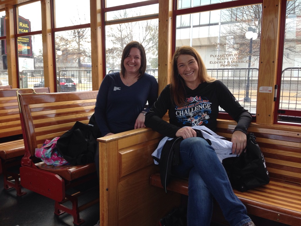 Little Rock is a 9 hour drive from my home (south of Chicago) and to be honest, I had NO IDEA what to expect from the town itself. No, Little Rock was never on my “to be seen” list of places I wanted to travel. No, I didn’t really know anything at all about Arkansas. I made the trip because of the race, because of the good things I had heard about it from other runners, because of the large number (270+) of Marathon Maniacs who were attending and because of that wonderful PR campaign that really drew me to the race and the town itself. And I must admit, Little Rock was a pleasant surprise with a beautiful River Walking Trail, lighted bridges, lots of restaurants and bars in the River Market District, President Clinton EVERYTHING (parks, library, museum, bridge), beautiful homes, historic landmarks & monuments, and an old Street Car Electric Trolley, which was one of our favorite things about the town. Street car on the left. Julie M & Judy F inside the street car on the right.