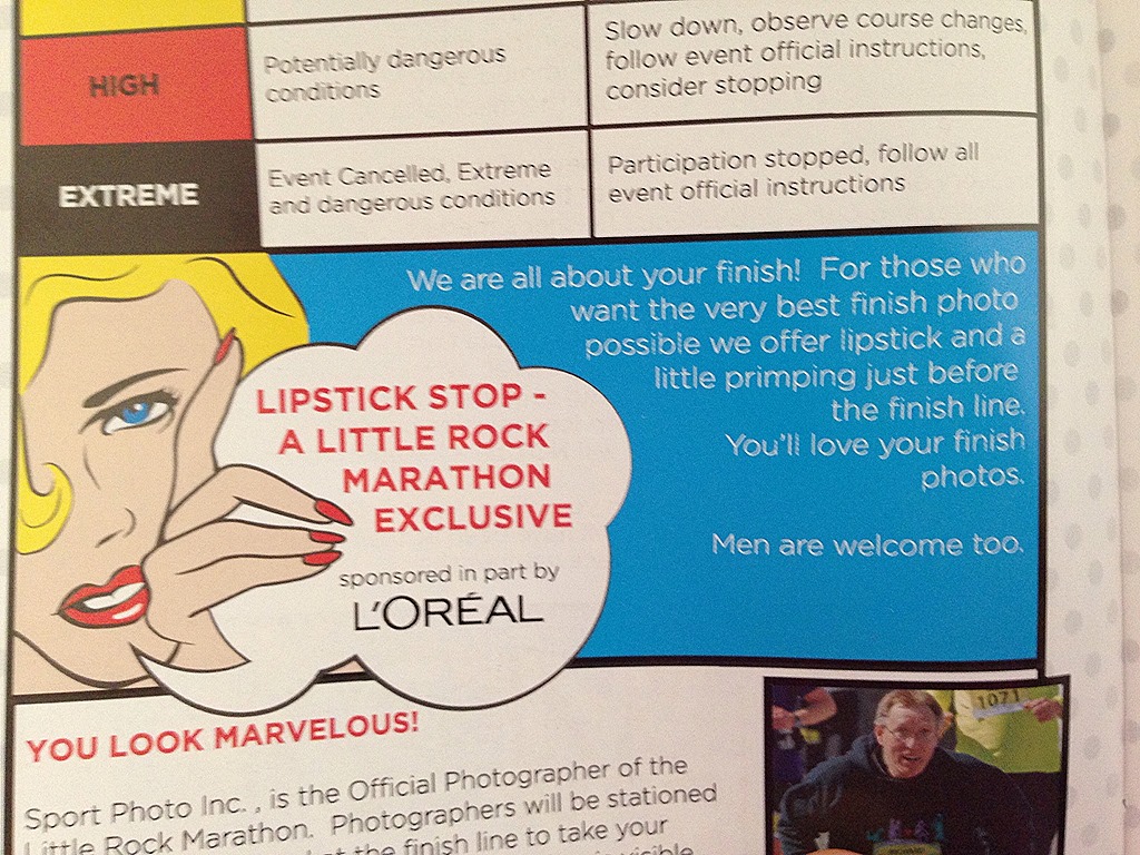 I loved how the booklet fit right in with the theme and was formatted in comic book style giving us a glimpse of what to expect. I particularly liked getting a heads-up to look for the lipstick “aid” station in the 25th mile before the finish.