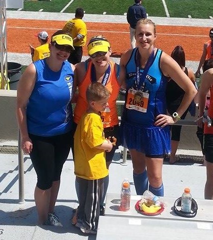 The gun goes off.  The first couple miles were fun with drunk college co-eds hanging off their porches and balconies cheering us on.  Then we moved thru a neighborhood with lots of support.  It was a fun charged atmosphere but I could tell that my legs just didn’t have much in them, so I slowed the pace and tried to find a rhythm.  I just need to finish the race to complete my challenge and become a 4 star Marathon Maniac.    I could do it!  Pace didn’t matter but I soon realized that it was going to be a more difficult challenge than even I had anticipated.  My “wheels” feel off early.  Things just kinda fell apart both emotionally and physically.  The weather wasn’t my friend either and to be honest, I was hot and miserable and tired.  Like really tired.  A combo of stress, lack of sleep and “maybe” 4 marathon in 21 days had taken it’s toll.  I was toasted.  Moving on mile by mile and hating every minute of it.    The bright spot was definitely seeing the kids at mile 13.  But that made me even more emotional and I just wanted to pack it up and go home but alas my keys were in someone else’s check bag.