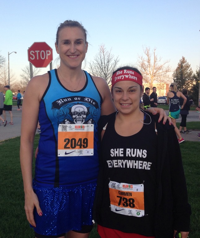 As for the Illinois Marathon itself, it was a very well organized event.  The marathon weekend offered something for the entire family.  There was a 5K with 6,137 finishers, a 10K with 2,532 finishers, the half marathon with 5,663 finishers and the full with a mere 1,682 finishers.  The weekend also offered an I-Challenge for runner who wanted to participate in the 5K on FRI evening and then one of the other events on SAT morning.  Fun!!  Plus a lot of my area runners were also participating so that ups the fun factor for me.  Here are are a few members of my running club pre-race, and pic with my speedy friend & fellow Touch Chik Carmen who I got to see before the start.