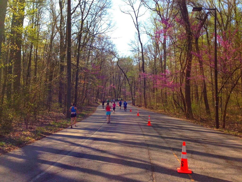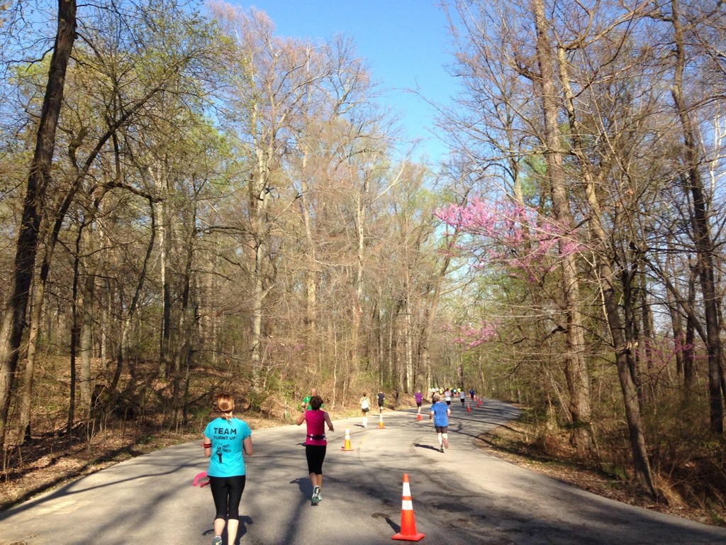Then we were soon out of Churchill Downs and ready for the half/full split, which I was not at all expecting.  I was still on the high from Churchill Downs and just followed the crowd {and my new buddy Greg}, the majority of which was running the half.  It took me a minute to process that  1)  I was on the wrong side of the split and 2)  My new buddy Greg was running the half.  BOOOO on both accounts!  I quickly corrected the situation and fortunately didn’t trip up too many people the race coordinators anticipated a “few” people messing up the split because they left open sections in the fence for those of us who ended up on the wrong side.  Thank you!!    Now onto the real challenge, Iroquois Park, which encompassed miles 11-15.