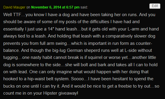 Who’s #6?  David Mauger, AKA “Frogger”.  Congrats, Frogger!!  Get your new pooch out and running with this Hipster Hands Free system!!  But beware of those squirrels so that powerful girl doesn’t pull you off your feet!!