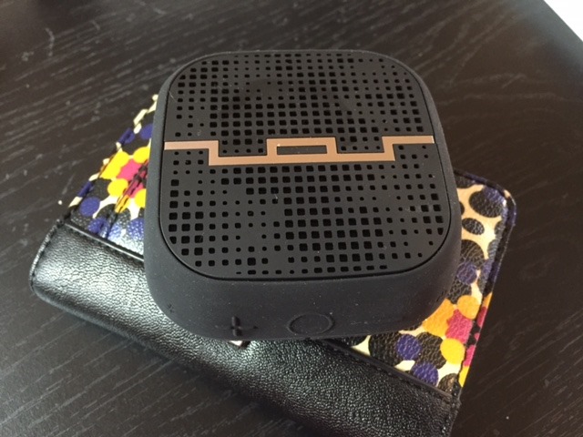 It’s small.  Like fits in the palm of my hand small.  My wallet is larger than this speaker!  It easily fits in my purse, gym bag and the pocket of my vest.