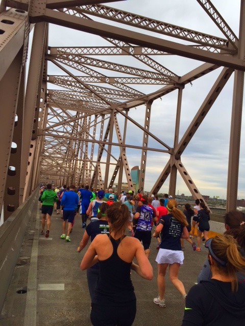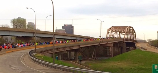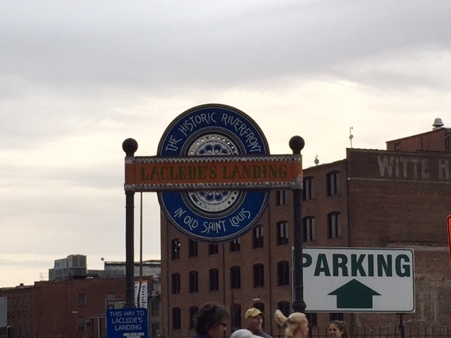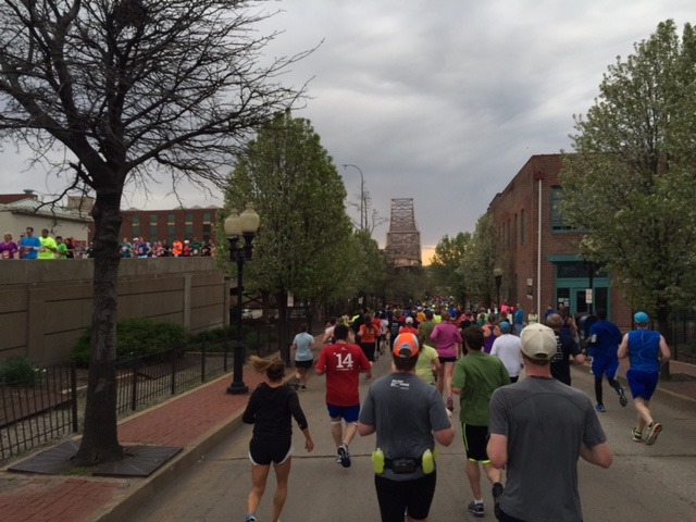 The second bridge bounced.  Maybe a suspension type bridge of some sort?  Regardless, it was a very odd feeling and some people even shrieked from surprise.  However, as soon as we were over the bridge we were headed down by the St Louis River Front via Laclede’s Landing.  Ah, The Landing.  The place that I heard so much about before our trip.  We even had one friend warn us to just avoid it “at all costs”.  But on foot, in a marathon, it’s all good.  And it was a beautiful area.  Flowering trees, lots of parking and restaurants/bars galore.  Local rumor is that the gangs have taken over this area and I’m pretty sure that’s a true statement.  There were zero spectators in the area.  And there were several  “young men” walking around various streets dressed exactly the same, even though they weren’t visibly together.  So I’m glad I got to see The Landing in a safe environment and I hope that St Louis is able to reclaim The Landing for the residents and tourists because its worth the fight.