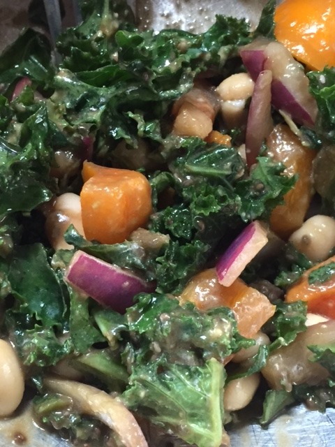 I’ve also made a few changes on the food front.  I’ve always been decent about my food choices but things took a turn south last year.  While I normally favor fruits & veggies, my love of carbs took over and I was eating WAY too many cheese quesadillas & flavored Triscuits!    I tried to balance out my carb intake with exercise.  You know that never works but a carb lover can hope, right?  Then I tried to decrease my carbs and up my protein.  That helped temporarily but I quickly tired of protein powders/shakes/smoothies.  And my body didn’t love all that protein either.  Plus I was still craving those junky carbs!   Then one of the books I was listening to last month (Born to Run by Chris McDougall) mentioned a change he had made that helped him control appetite and lose weight.  Salads for breakfast.  What?  Yep, salads for breakfast.  I figured it was worth a try.  I bought some fresh produce, developed an obsession for kale, and started making a humongous salad every morning after I returned from the gym.  I filled my salads with nutritious items, healthy fats, plant proteins and tons of veggies.  Not a wimpy, “diet” salad but real food that would fill me up!  Every day.  Today’s salad below.  Kale, red onion, avocado, yellow pepper, northern beans, tomato, chia seeds, olive oil, balsamic vinegar & sea salt.