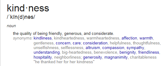 In a day & age where presidential candidates need to run on a platform like “Make America Great Again”, I think we sometimes forget that America IS great.  Perfect, no.  Great, yes.  We have the freedom to do anything we want.  To chase any dream or goal that we can conjure up, regardless of how silly it might be to others.  We have choices.  What will you choose to do with today?  How will you behave?  As you think about that, I want you to ponder the word kindness.  Definition provided by Google.