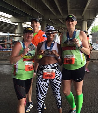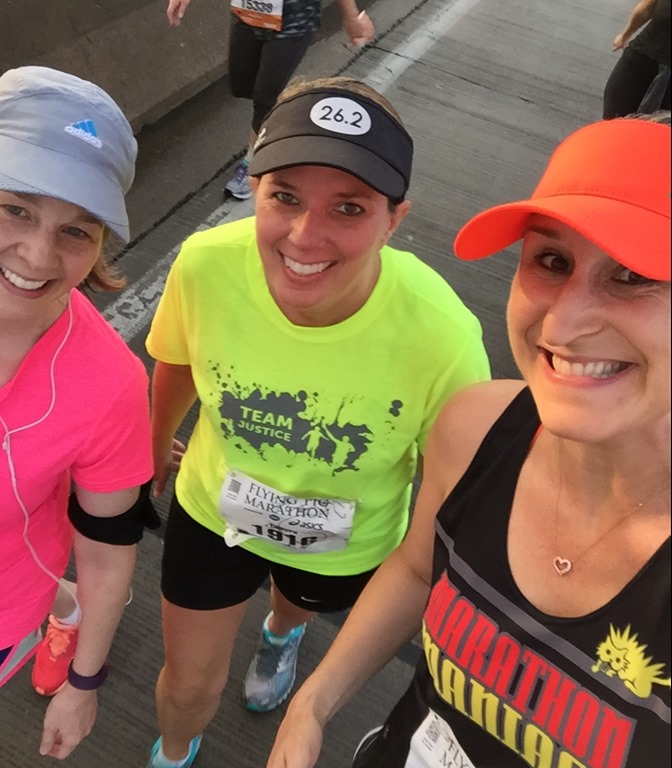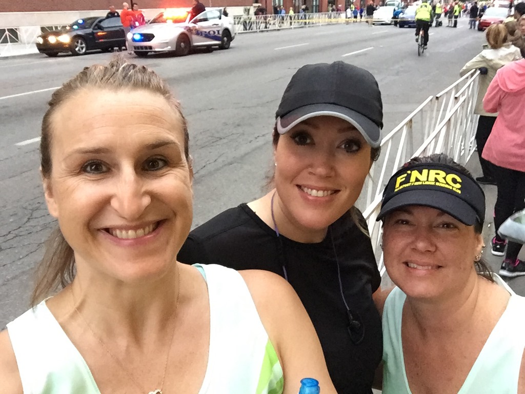 Her run plan was to crush the hills. My run plan was to 1) not let the hills crush me, 2) have fun, 3) find some bacon, & 4) run with my friends! So I went back a corral to be with friends and hope that they would walk up some of the hills with me! Found Julie B at waiting for us at the entrance to Corral F! Julie B, Tamyra & I walking up one of the bridge inclines around mile 3. All smiles.