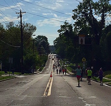 By the time we got to Mariemont and were headed back to the City, the temps were soring and the runners were starting to suffer. Some had been suffering for quite some time. I was hearing a lot of ambulance sirens. I was worried about those around me. I was doing okay but going at a very pedestrian pace. Lots of walking. Lots of water intake. Lots of electrolyte intake. I hit every sprinkler and loved the Cintas station that set up with icy cold towels, dry towels and full water hoses with shower heads! About the time things started to get really bad, race officials had gotten ice and were bringing it back to runners. They had gators loaded with cases of water, huge bags of ice and were proactively headed from the finish back toward the runners still on course. I was very impressed that although they had not planned for the higher temps, they were proactive and did what they could to help the suffering runners. That’s a great race organization that is able to react quickly to a less than ideal situation.
