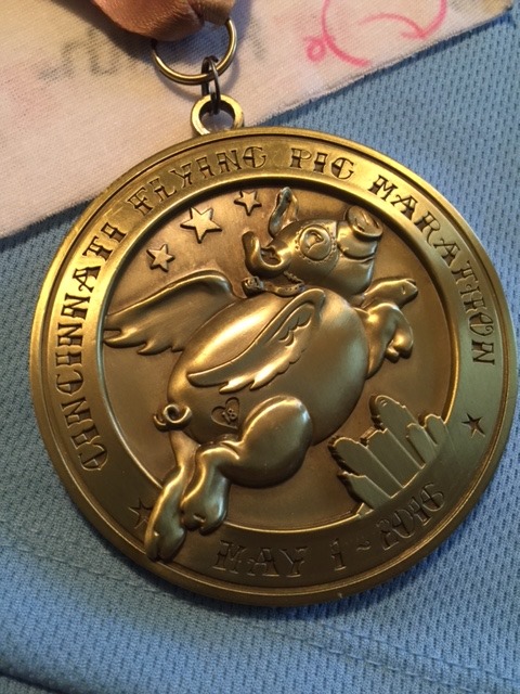 There were also about 30 bike support people on course who were watching the runners very closely. They had supplies on their bike and would go get something a runner needed. Med & aid stations toward the end were stocked with margarita shot blocks with extra salt, Coca Cola and things that we normally don’t see at road races. I was very, VERY impressed with the Flying Pig Marathon. I will definitely go back and run it again.