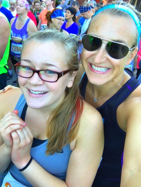 After getting the girls off to their volunteer spot, I want and sat for a bit. I was in the second wave this year. Corral J. While the marathon started at 7:30am, I didn’t have to be in my corral until 7:45. I started running at 8:30am. Plenty of time for pics!! I even managed to connect with Diana & Sarah from my local TRI Club! Congrats to Sarah on completing her VERY FIRST marathon!
