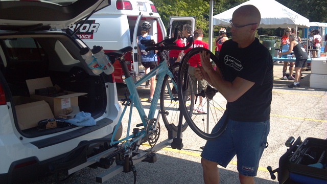 Venus 2012_Greg When I got back on course, it was not a smooth ride.  Greg told me that it was going to be bumpy but I should be able to limp it to the next bike support tent.  If I understand it correctly, my new tire needed to stretch out and it wasn’t properly seated.  Every time the tire went around it was like I hit a bump.  So I was just bumping my way along and the course sweepers, or the caboose as they called themselves, came up on me.  I was the last person on the course at mile 31.  Awesome.  So I joined the caboose and we powered thru to the next rest area and rolled directly over to Torsten, the rest stop #3 Trek specialist.
