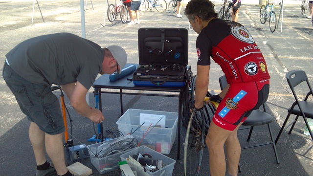 Venus 2012_Torsten & MikeTorsten, with Mike “The Sweeper”, pulled a MacGyver and used electrical tape to cover my damaged rim wheel tape to allow the tube to sit in its proper spot and then the tire somehow slipped into position.  I can’t even pretend to understand but I was told a billion times to make sure I took my bike into the shop to get this fixed properly.  He also told me that “X” bearings were shot and needed to be replaced but by then my brain was mush and I have no idea what else is wrong.  Good news, this short 15-20 minute repair got me thru the remainder of the ride.