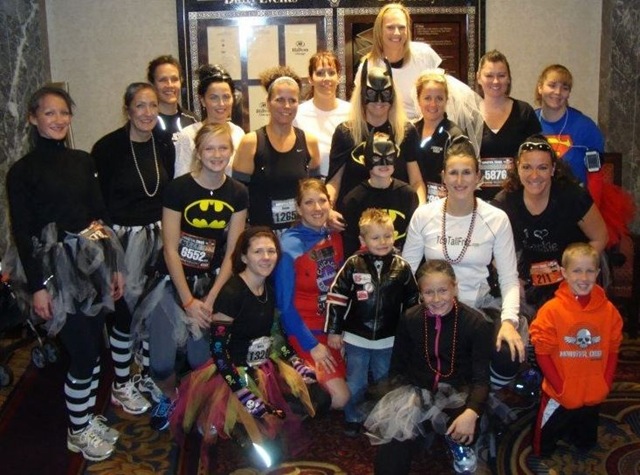 Once I was signed up and not necessarily expecting a great race, I figured we better make our own fun and dress up.  Well what fun is it to dress up solo when you can get a group of  F’N Runners to do the same?  So we had 18 Brides of Frankenstein (photo below on the left) and lots of others who participated by wearing a costume.  F’N Running Club photo below on the right.