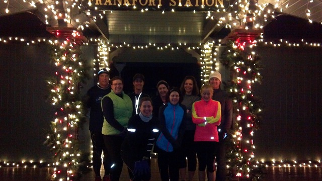 My favorite WED night, photo spot is back in operation!  The Frankfort Station pavilion beside the Grainery.  Christmas Lights are up, check!  Runners are in place (above) with a smile, check!   Left Back:  Ken, Dawn, April, Lynn, Susan & Nicki.  Left Front:  Diane, Betsy & Aby.