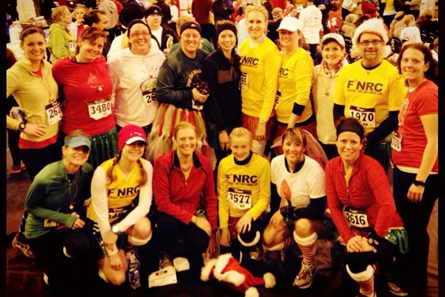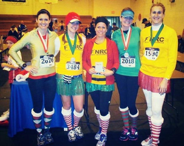 During my moment(s) of indecision, we about missed the start, and were standing in the grass when the gun went off.  Myself, Aby & Nicki are below on our way to the start.  Thanks Kim M. for all the F’N photos in this post.  If not for you, we would only see words on a page.  I appreciate your constant, unwavering support of all of us!  JingleBell_2012_me aby nicki