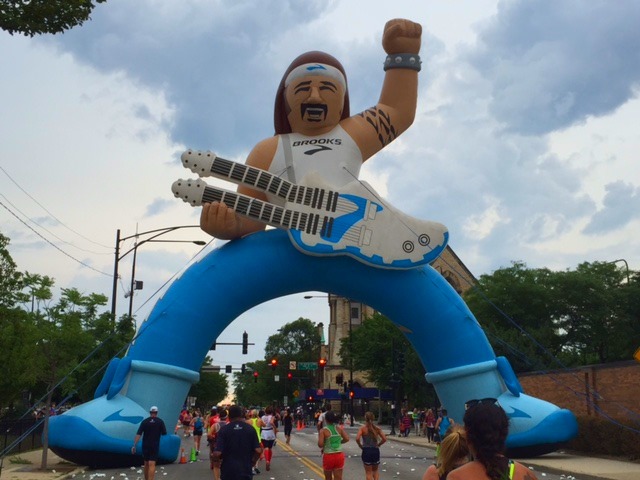Once we finished the out & back on MLK Drive, we head toward McCormick Place & the last 3 miles of the course. There is always a giant inflatable Brooks Running guitarist at the 10 mile mark. Happy to see him, as usual. Then on to finish the race!