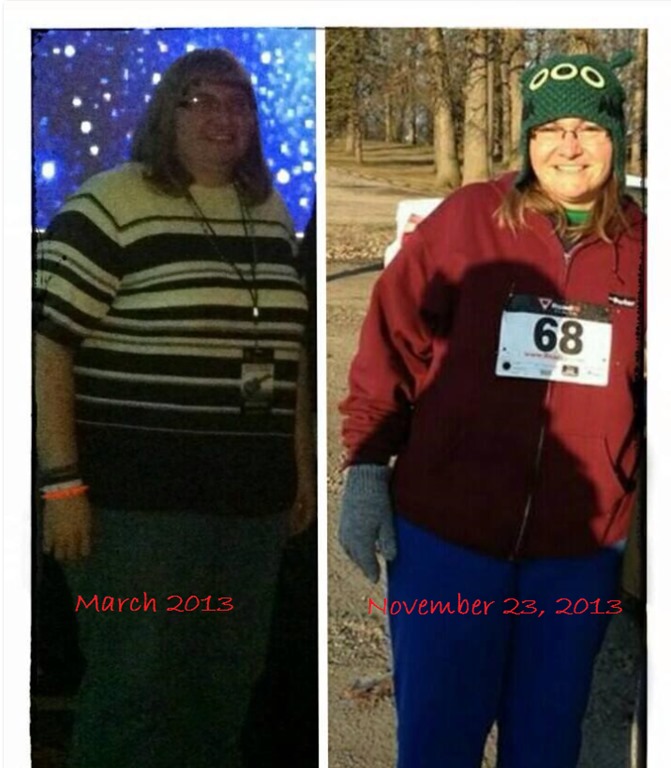 I didn’t like to have my picture taken at all when I was that “big”. I seriously considered not going to our 20 year class reunion because of my weight. Then when I saw pics posted on Facebook of our whole class, I felt so embarrassed of how big I had gotten. I had been depressed in 2009 while I was laid off from work for 9.5 months. I finally got to be way beyond what was even acceptable to me. I had to do something about my weight. I was concerned about becoming diabetic or afraid something else bad would happen like stroke or a heart attack. I was worried. So on June 22, 2013, I started my first AdvoCare 24 Day Challenge. I lost 13 lbs and 18 inches in that first 24 days. I was excited to see what it was doing for me. I felt more energetic and my clothes were fitting better. As the weeks went on, I stuck to the clean eating and even started running. I started with the Couch to 5K app on my phone. Shin splints stopped me after about 3 weeks. I was still walking some and bought compression socks to help with the shin pain. A week before my first 5k I got my very first pair of Brooks running shoes at Three Rivers Running Company in Fort Wayne, IN. It made a huge difference in how my legs felt while running. I’ve lost a total of 50 lbs in 5 months. I’m still on the journey of losing weight. To be honest, I’d like to lose 50 more! I want to show my kids that when you want something bad enough, anything is possible. My son is now showing some interest in running. He’s only 9, but he goes with me when I’m only running a mile or so. I love it because he assumes the title as my trainer and says little things like “keep up the pace” or “keep running, you can do it”. My daughter likes the lifestyle change too. She loves the healthy foods in the fridge. She’s always eating all of my fruits and veggies. Lol! She also loves tilapia and turkey burgers. I don’t have to worry about anyone eating all of my plain no fat Greek yogurt though! Please see my before & after pic below. The “before” was in March 2013 and the “after” was the morning of my very first 5k, November 23, 2013.