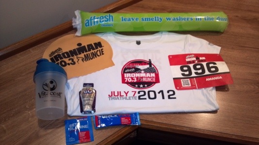 Lastly, thumbs up for Muncie. They continue to deliver a great race, year after year. Amazing volunteers. Great venue. Best post race food in the Midwest on the IM 70.3 circuit. If you are looking for a race that is good for beginners & experienced racers alike, Muncie might be for you. It is in the middle of nowhere but its worth the trip. Expect a non-wetsuit legal swim, flat bike with a few rollers, and a hot/humid run with some hills. And the SWAG is below. Cute bag, cute gender specific shirt & I’m loving the medal this year!