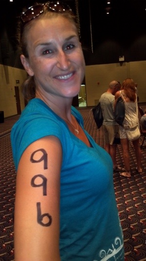 As we swam around the second turn buoy, heading back to shore in the final leg of the swim, the sun was in our eyes. So blinding. I’ve done this race 2 other times but the sun seemed so much brighter this time. I couldn’t see the buoys at all. Had to stop several time to see if I was on track. This last leg should have been where I picked it up but I didn’t since I couldn’t see. In fact, I was so blinded that about half way thru that final leg, I swam up on a gentlemen from one of the waves in front of me. Scared the poo out of me. I froze, popped my head up & apologized. Well, I must have really tightened up when I hit him because my left calf cramped & I was dead in the water. Quite literally. Clutching my cramped calf in one hand, trying to swim with one hand out of the way of all the bazillion swimmers who were fighting to get around me once I stopped. Not fun. I couldn’t get the cramp to pass & was trying to massage it in the water. Hundreds of people passed me as I was sidelined & then I was eventually able to start swimming again & get out of the water. Yes! Victory. Back on land. Better yet, there were wetsuit strippers!! Life savers because with my back in its current state of disrepair, I really struggle getting out of my wetsuit. Super thankful for the lady that helped me & helped pull me back up off the ground since I was struggling there too!