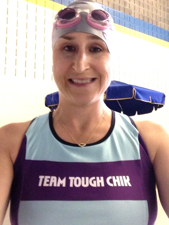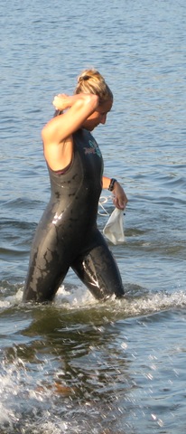 Transition closed at 6:45 since the first swim wave started at 7a. We left our shoes, grabbed our swim gear and wetsuits. The bonus of a stormy Friday was wetsuit legal temps on race day! First workout of the day, wiggling into our wetsuits! Then my wave took off at 7:45a. Get ready to swim, bike & run!!!