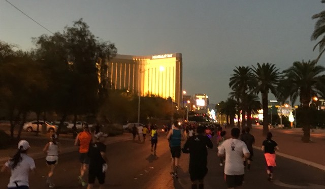 And as the lights of Freemont Street faded behind me, I knew that the “fun” was almost over for the marathoners.  As the half runners were joyful & close to their finish, we turned off around mile 11 into the darkness.  Away from the lights.  Away from the crowds.  Away from the “fun”.  Some streets were lit with streetlights.  Some not lit at all.  Random bands were out on the marathon route and since we were weaving in and out of parallel streets, in a very close vicinity, I could hear a band multiple times at various places on the course.  We still had a clear path, no question as to where we were headed or where to run.  It looked really confusing on paper but the route was well marked and there was never a question as to the direction we were headed.  I was impressed with the volunteers & the volume of Las Vegas PD Officers who were out on course helping us.  I can’t imagine the number of people it took, all working together, to make this a successful event.