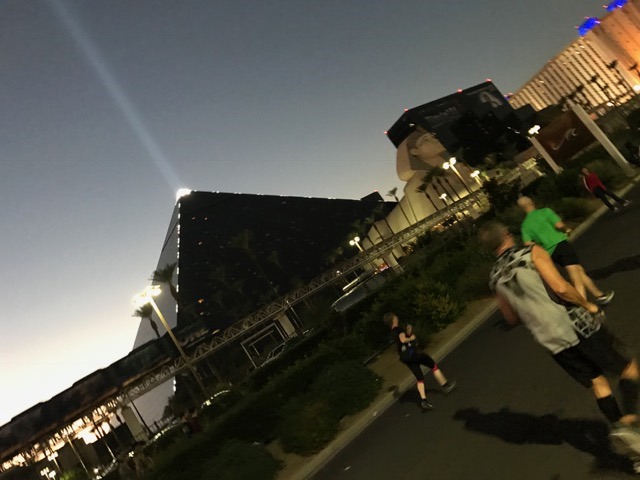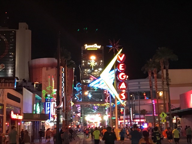 This event is definitely crowded off the start but thinned out quickly.  It seemed like everyone was very excited and many people wanted to run fast.  Like really fast.   The sun was just starting to set when we began to run & it was cooling off.  Kinda nice. The first thing to be seen on course was the Vegas sign.  Welcome to Las Vegas.