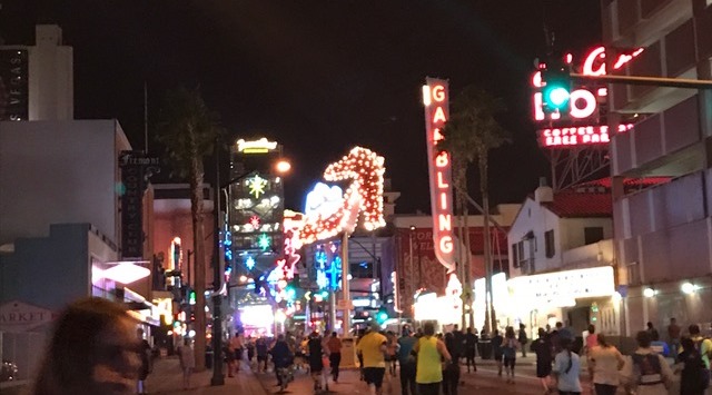 Around mile 8, Meb passed me.  Fast.  I heard someone shouting that Meb was passing & to say “hey”.  And then he was gone.  No pic for me.  Boooo!  Mile 9-10 down Freemont Street for a peak at the lights.