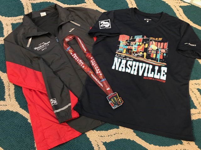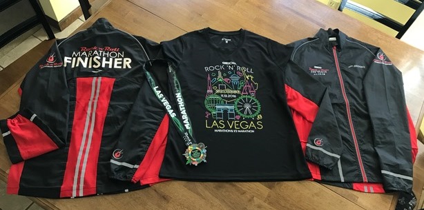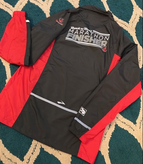 And a gender specific Finishers Jacket with reflective accents.  I used my New Orleans Finisher Jacket on the left (below) so you can see both the back & the front; however,  I only received one jacket for finishing the Las Vegas race.  The race tee is in the middle.  Gender specific.