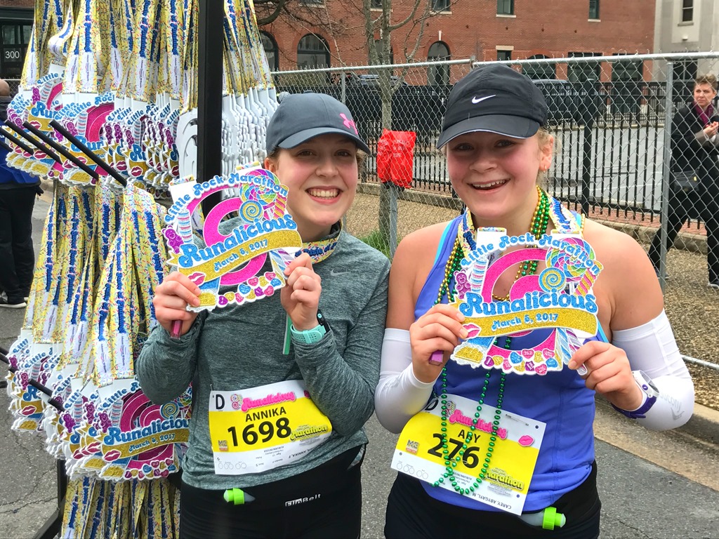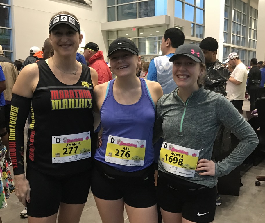 2017 has been all about preparing Aby & Annika to run their first marathon.  I must admit when they said they wanted to run a marathon, I tried to talk them out of it.  Marathons are long.  And hard.  And tough mentally & physically.  The distance will frequently break experienced runners.  The girls are young.  Aby is 15 & Annika just turned 17.  Yet they wanted to run a marathon.  It was really hard to wrap my brain around.  Its not something I would recommend for any teen, let alone those I know & care about!  Initially I wasn’t sure how to react but I put on the “mom hat” and explained to them that an early spring marathon would require them to be running outside, all winter long, in the early a.m. when I was running.  No sleeping in, I wanted them out there with me for every long run so I could monitor their progress, fueling & how they were tolerating the distance.  They would not be deterred.  In fact their first “long run” was the Huff 10 Mile Trail Race which was hilly, hard, snowy, cold, with freezing rain.  Absolutely miserable conditions.