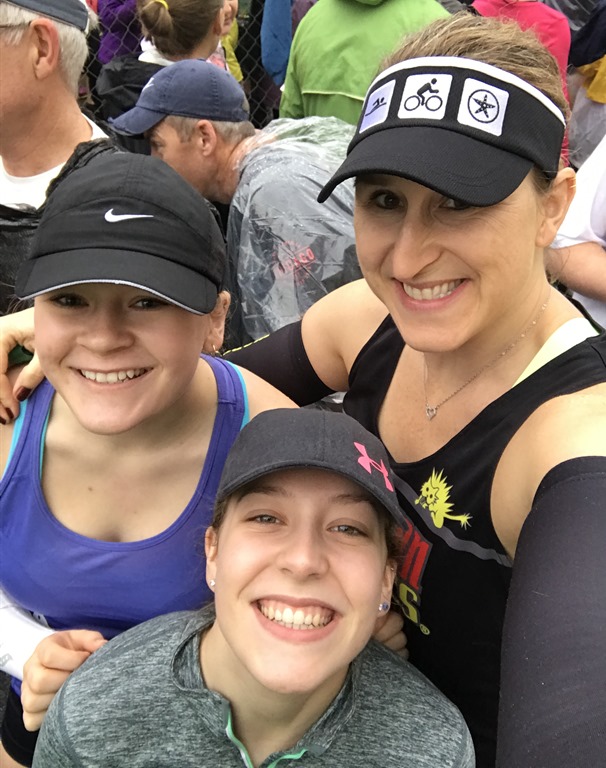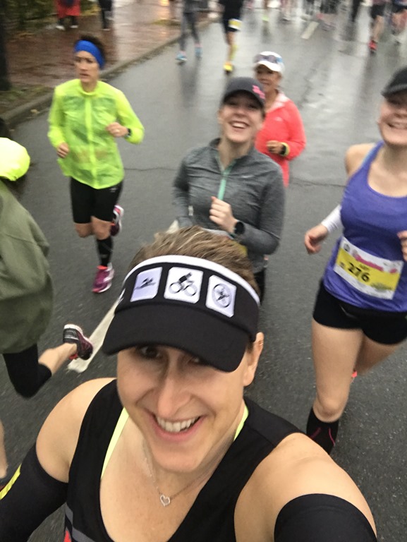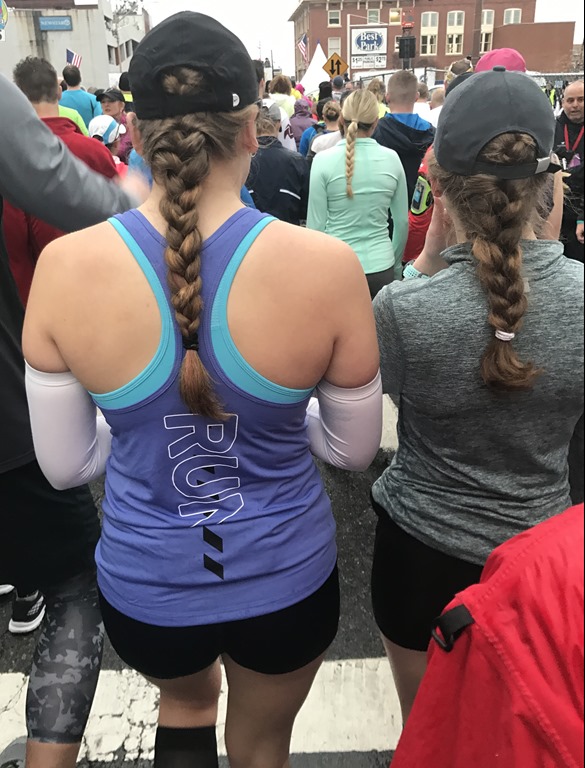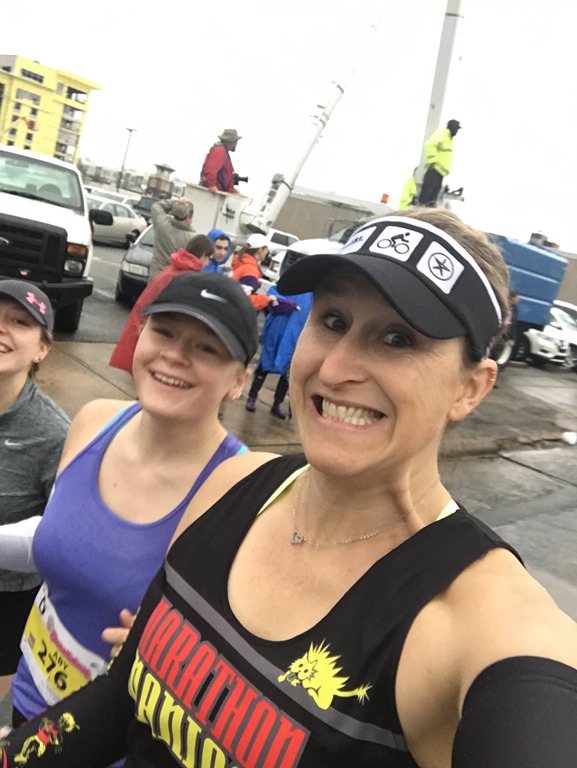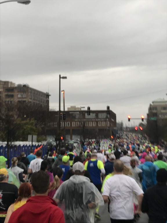 We woke up to rain.  Heavy but steady rain with a “feels like” temp of 43 as we headed to our corrals.  We were none too early either because I didn’t want the girls out in the cold rain for too long before we started to run.  I was a bit surprised to see how busy the streets were & the back up getting into the corrals.    Pace wasn’t an issue for us but I really wanted to be around the 4:30 pace group because that was the pace where we would start out.  I didn’t want to waste too much energy weaving around people in the early miles.   We were on the “just finish it” plan but we wanted to stay together & I wanted to try to keep a consistent pace.  I knew that I would have to be paying attention in order to keep them slow & steady.  They are XC runners and they just want to GO!
