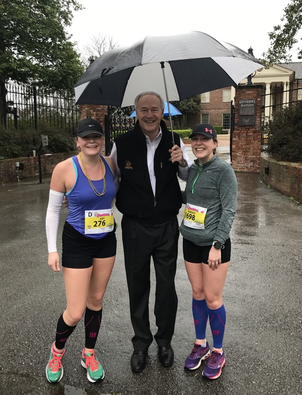The rain continued.  Light but steady.  People were complaining.  We just ran past them & pulled our hats/visors a little lower to block out the rain & wind.  Back over the bridge into downtown Little Rock.  Over the trolley tracks.  I tripped but didn’t fall.  We laughed.  Down Market Street, along the Arkansas River, around the Heifer International campus.  And then back thru town, up a few hills.  Then I recognized a street from last time and knew the Governor’s Mansion was coming up.  Aby had asked me 100 several times by this point if the Governor would be out.  I didn’t know but was hoping so & sure enough, I could see his guards  flanking him from pretty far down the street.  I pointed out who he was (verses the guards) and the girls ran right up to him for a photo.  Thanks for standing out in the rain, Governor Hutchinson, you made their day!