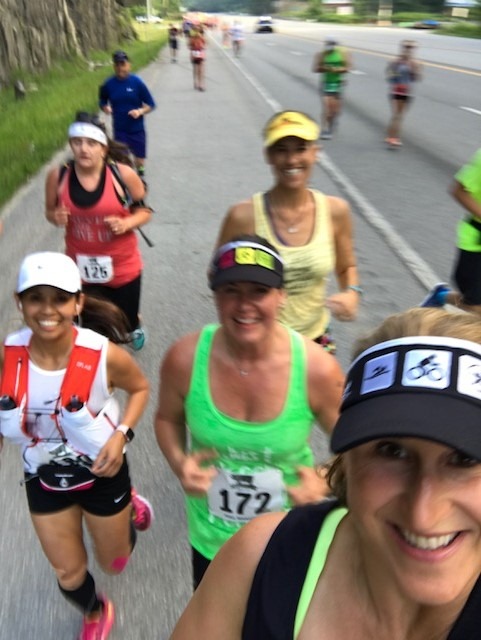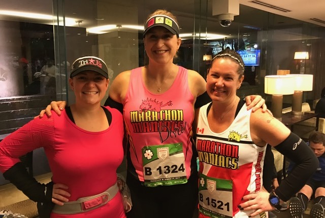 And friends.  That’s what I love about marathons the most.  The people I meet along the way.  The stories I hear.  The places we go.  Extra person in pink.  Amy in yellow (back), Lainey (white & red – left) & Julie in green.  A little blurry but still a fun shot.