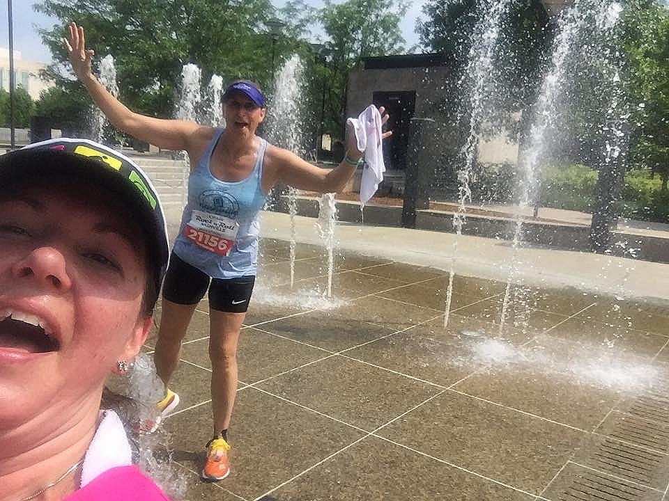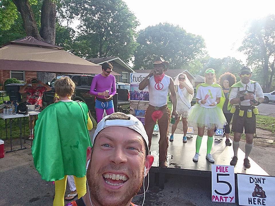 The second half of the race was full sun.  Not ideal but the aid stations were close together, about every mile.  They had cold water, ice, bananas, oranges, watermelon, gels, electrolyte tabs, pickle juice &  other random goodies.  We even had a volunteer or random stranger (who can really tell?) drive by at some point handing out Twizzlers.  Smile  We definitely felt welcomed into the various communities and even though the race shut down a lot of roads, everyone seemed content to help out or sit on their front porches & wave as we ran past.