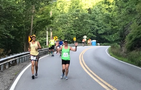 This is a small race.  I’m not really sure how I found it but its been on my list for over a year.  Normally, the event features a 50 miler, marathon & half marathon.  However, this year the 50m was downgraded to a 50K for safety reasons and to keep the event moving/quick due to Covid-19 concerns. My race schedule is a lot about timing around the kid schedules.  I don’t usually read too much about races.  I like the element of surprise and want to experience it for myself without too many preconceived notions about quality, difficulty, etc.  So, with that being said, I knew this was a trail race and that it would be hard.  I knew that there was “about” 2400 ft of climbing.  I also knew that we started by climbing Mt. Misery.  That should have been foreshadowing.  If you follow me on Instagram or FB, then you’ve seen some of the photos.  But let it suffice to say, that this was a difficult race. I have a new PW (personal worst) for trail running performance.  But we made it to the finish line safely and as someone so kindly mentioned, we received the same finishers medal as the person who finished first.   First climb of the day, Mt. Misery.