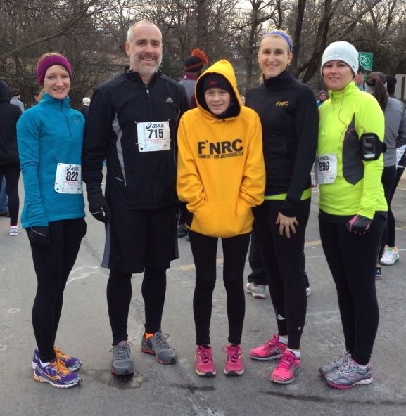 This year was a normal year. I was healthy. Conditioned. Ready. Going in I felt fit, somewhat fast and was ready to see what I could do. My only concern was that I had registered Aby and in my head, I was tossing around the idea of running with her. The course is HARD. Lots of rolling hills. Aby is good on hills but a Thanksgiving race puts her out of her season and not anywhere near peak conditioning. It’s the end of running season for her and the start of volleyball. Last year since I was just coming off an injury, I ran with her and she wasn’t necessarily grateful. We normally do not race together but rather “run our own race”. Since that time, we made another attempt to “race together” and while it went much better, the fact of the matter is that we are different runners, have different strengths {and weakness} and to be honest, it doesn’t do either of us any good to make the effort to race together. We don’t “need” each other and in reality we hold one another back at various points, resulting in neither of us having our best race. So, I decided to let it fly off the start line and she would either follow, or not. Pre-race photo while we shivered waited. Me & Aby on the left. F’N Runners on the Right: Pam, Brian, Aby, Me & Nicki.