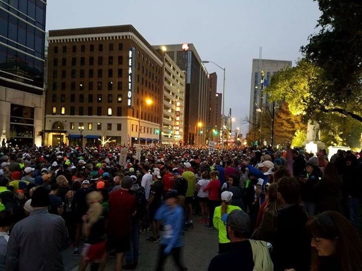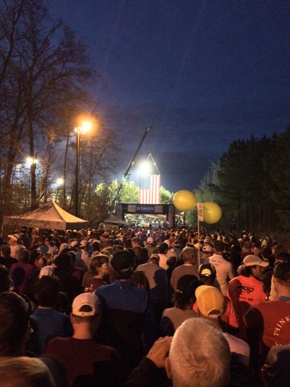 The race started promptly at 7am. Start/Finish area was easy to find, just down from the row of port-o-potties. It was still dark when we started the race but the area was well lit around the bathrooms & the start/finish area. Photo courtesy of the Tobacco Road Marathon Facebook page: