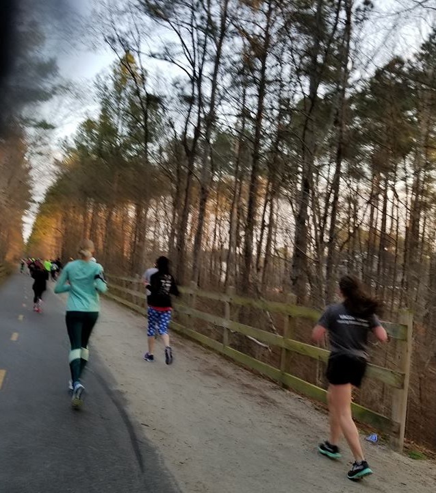 Race day started bright and early like always. Getting to the race site required some planning. There was a local pick up area in Cary called NetApp, where people could park & get shuttled to/from the race site. There were a few onsite parking spots that required pre-purchased parking passes. Then there was runner drop off at the venue. Fortunately, my daughter now has her license. GASP! She was able to drop me off, then drive back to the hotel with her little brother, then return to pick me up. This race would have been challenging, logistics wise (as a mom with kids & no other adult to supervise), had she not been able to drive. I’ve taken them to a lot of races & I usually pick a hotel on the race course or close to the start/finish so they can sleep in at the hotel, then come to the race when they are ready. This race started at the park, then ran to the American Tobacco Trail, stayed on the American Tobacco Trail, then ran back to the park for the finish. You need access to a car to get to packet pick up and to/from the race. No shuttles for local hotels. No way to spectate without access to a car.