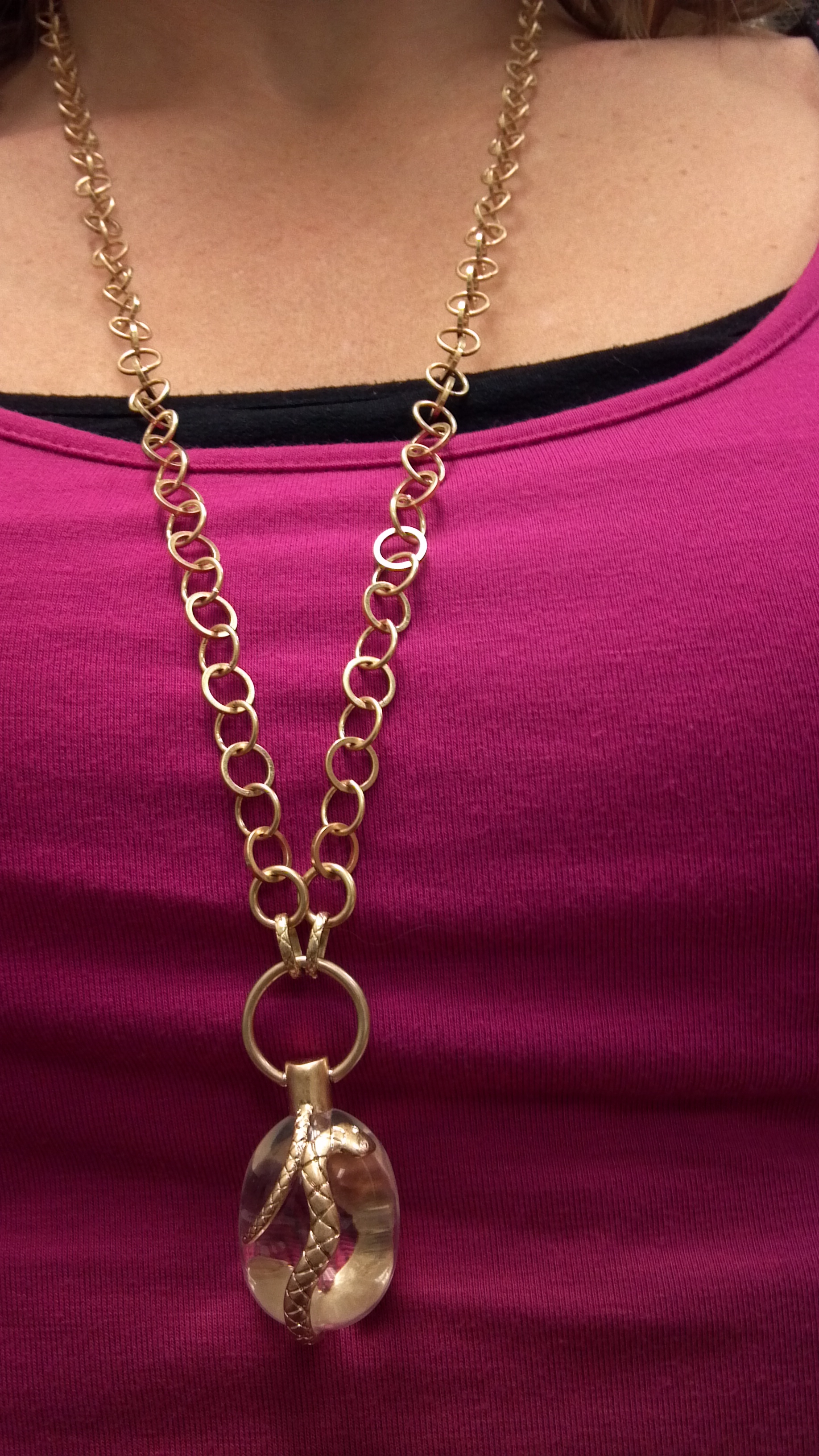 Stella &  Dot – Snake Orb Pendant Necklace – Quite possibly the only “fashionable” thing that I currently own.  It has been featured in several magazines and my friend Elizabeth B. just became one of the Stella & Dot stylists.  CLICK ON THE LINK and  BUY ONE FROM HER NOW!  As a side note, Michael LOVES this necklace and is constantly grabbing it to kiss the snake and then just keeps hissing at me and the snake.  Absolutely precious but I’m sure my necklace will hit Mick’s Costume Jewelry Repair Shop before the weekend.