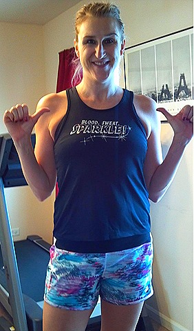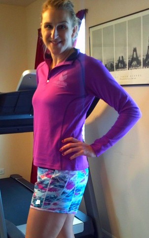 Treadmill “Run”Way Fashion – Tough Chik Toughie Half Zip which is super light and my new favorite shirt for bumming around the house.  It didn’t even make it on the treadmill cuz I didn’t want to get it “dirty”.  I actually ran in the Blood, Sweat, Sparkle shirt I picked up on sale from Team Sparkle.  I didn’t love this tank.  It was a “little” short on me and it didn’t fully cover my bra, plus was just too narrow up top for me.  I think it’s going to Aby’s closet.  Then the BIG thing, I tried the Redemption Shorts from Skirt Sports.  I have been wanting at least one pair of shorts, particularly now that I’m running on the treadmill more.  I don’t always feel like wearing compression shorts and I don’t necessarily want to overdress wear a skirt in my dining room “gym” so when I saw that Skirt Sports dropped a line of shorts, I jumped on board to try them out.